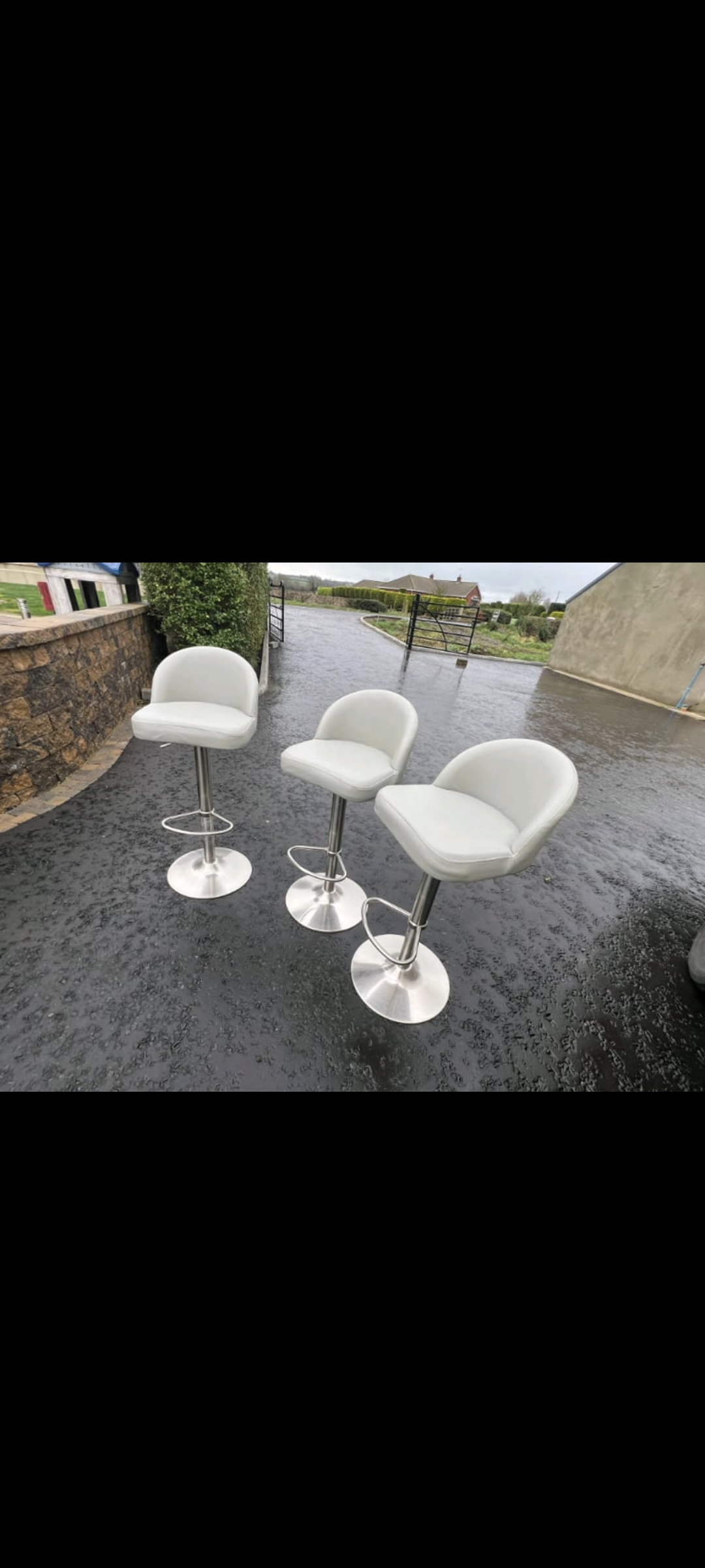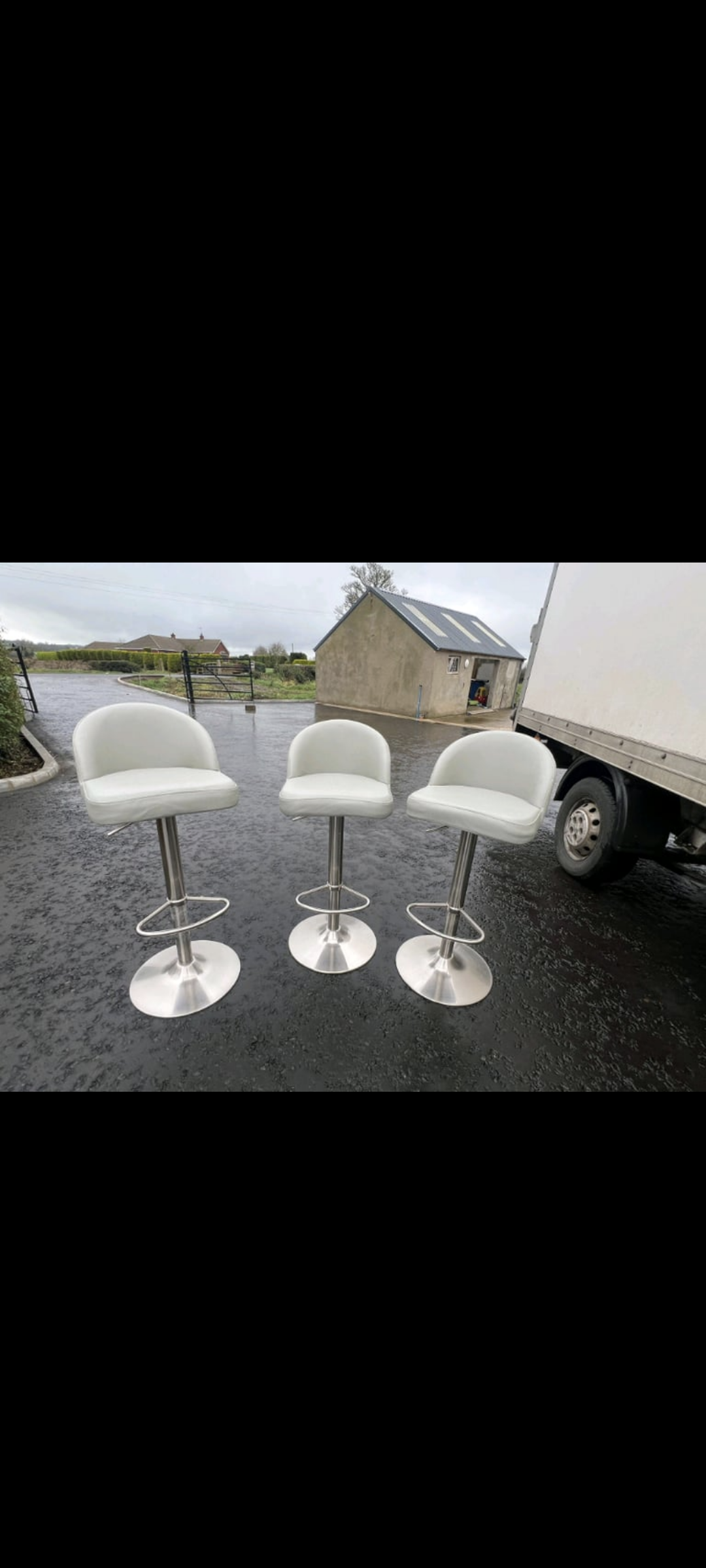 Upgrade your bar seating with these modern and stylish leather and chrome bar stools. With a set of three, you'll have enough seating for all your guests. The leather seats provide comfort while the chrome finish adds a sleek touch. Perfect for any bar or kitchen island.