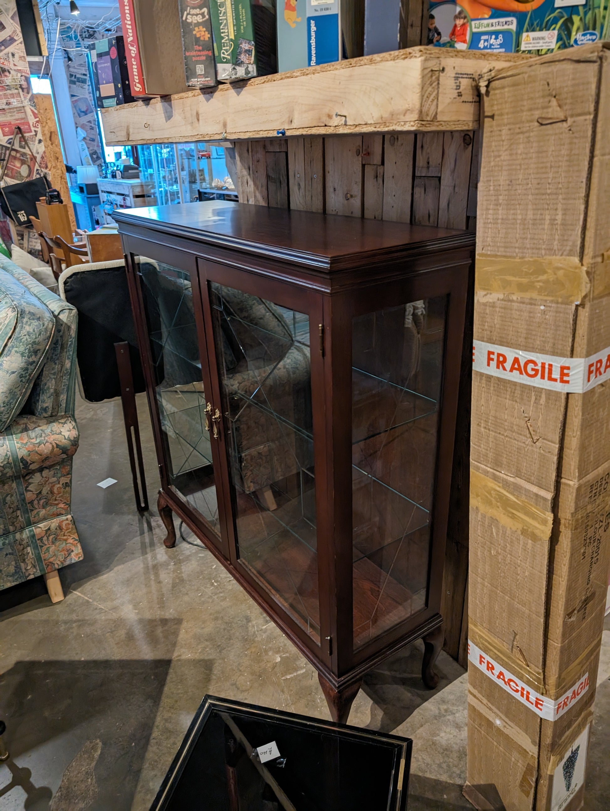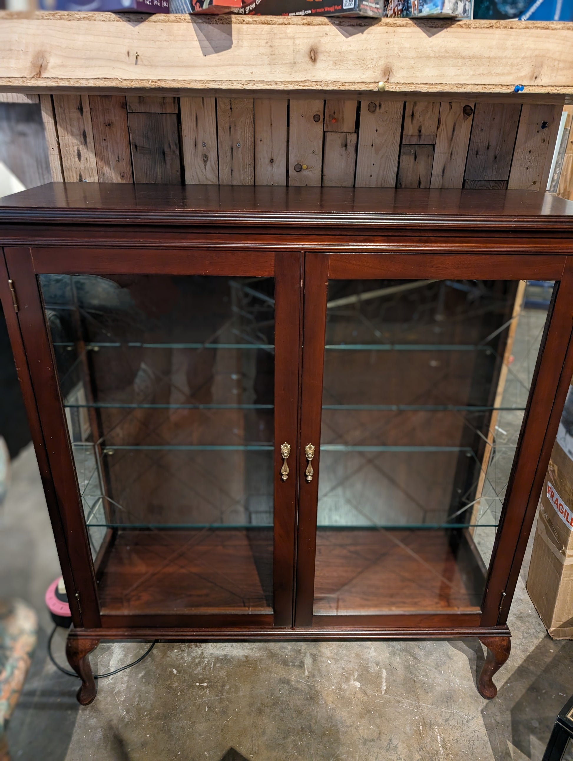 Expertly crafted with vintage wood, this spacious display cabinet exudes timeless charm. Perfect for showcasing your collections or storing your belongings, it seamlessly combines style and function in one beautiful piece. Its large size allows for ample storage space while adding a touch of sophistication to any room.