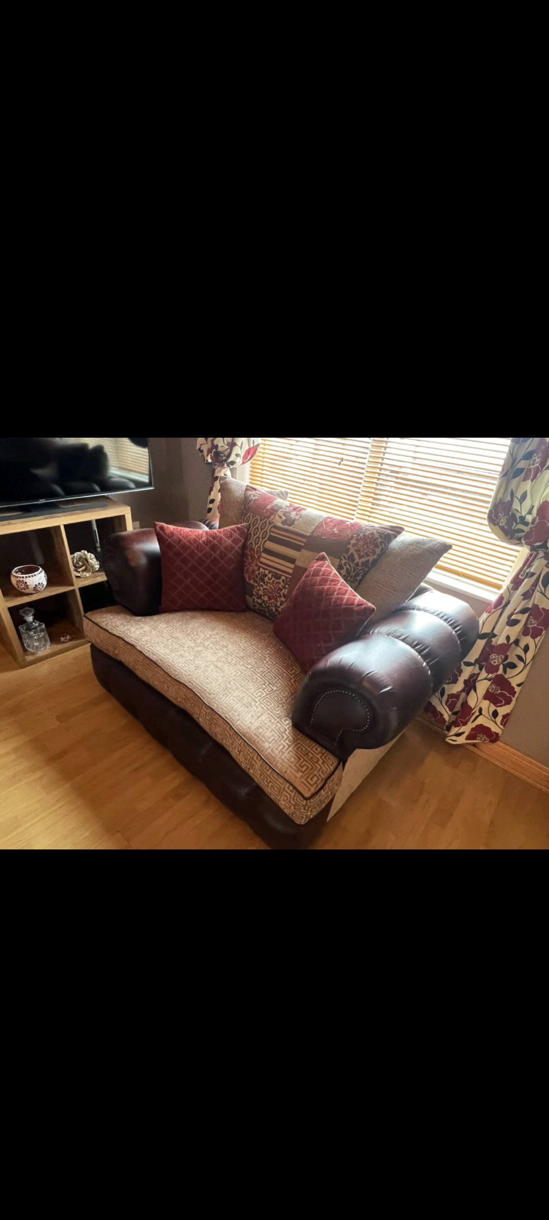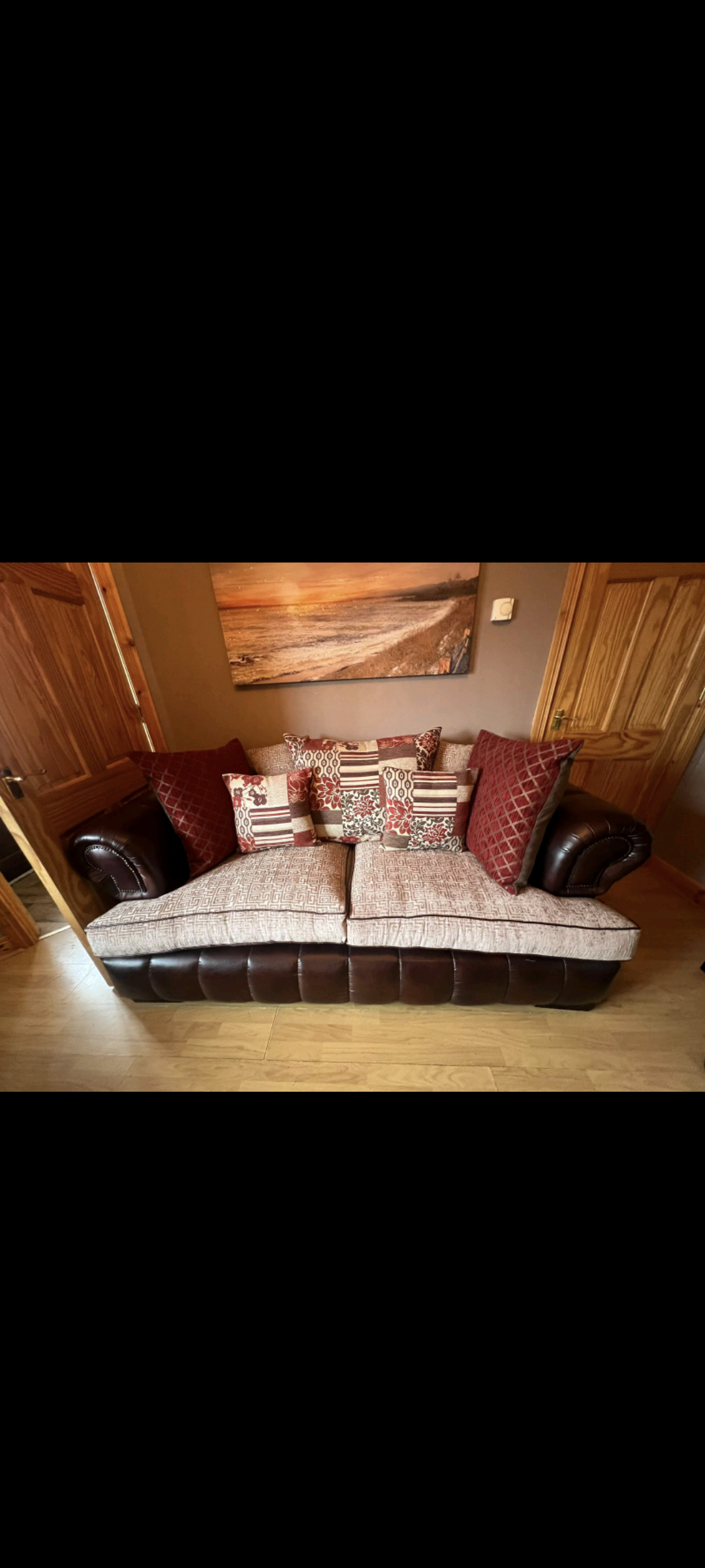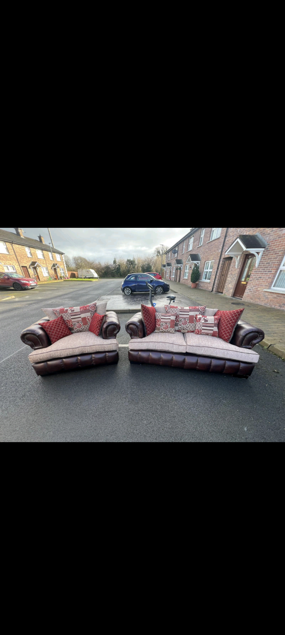 This sofa bundle includes a 3 seater and 2 seater sofa, both made with high-quality thick leather hide and fabric. Enjoy the durability and comfort of this stylish set, perfect for any living room. Expertly crafted for long-lasting use. Worth £3000!!